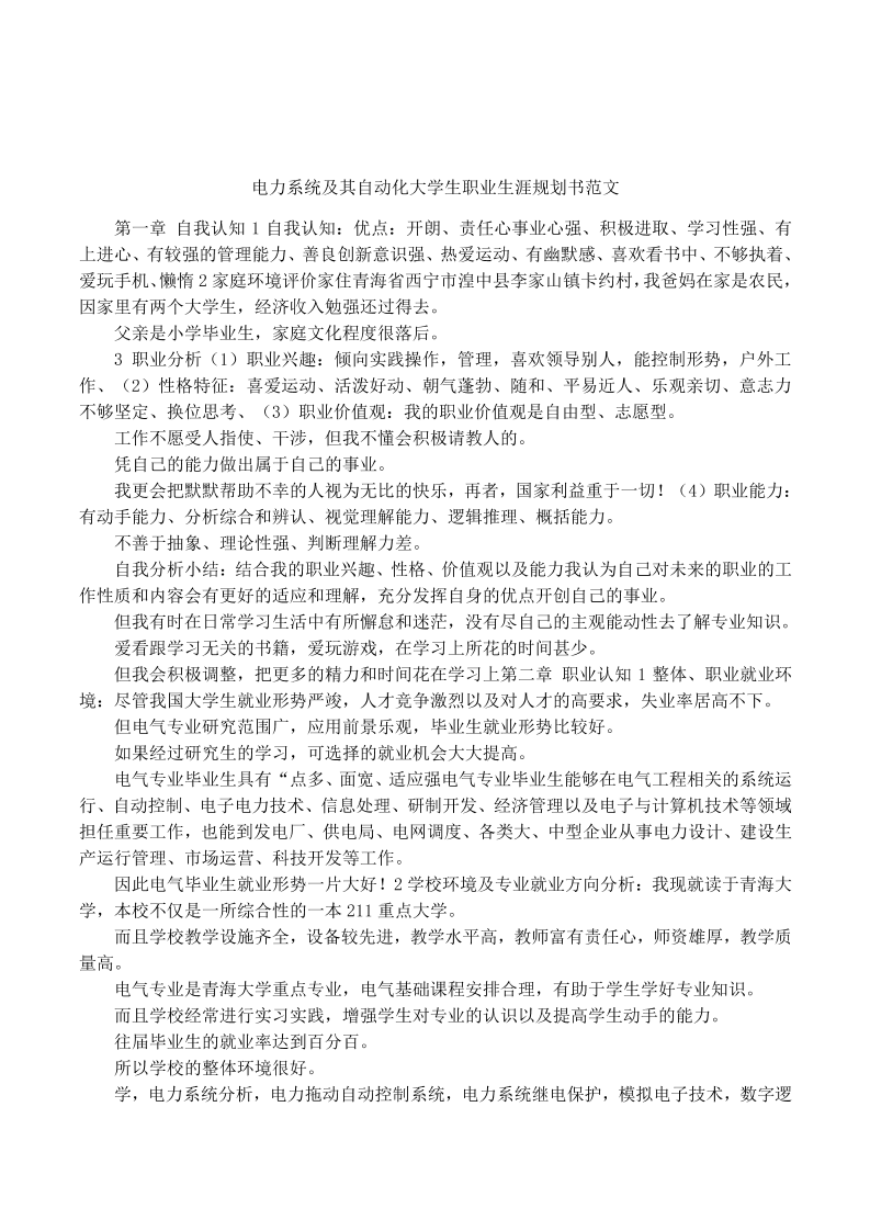 电力系统及其自动化大学生职业生涯规划书范文