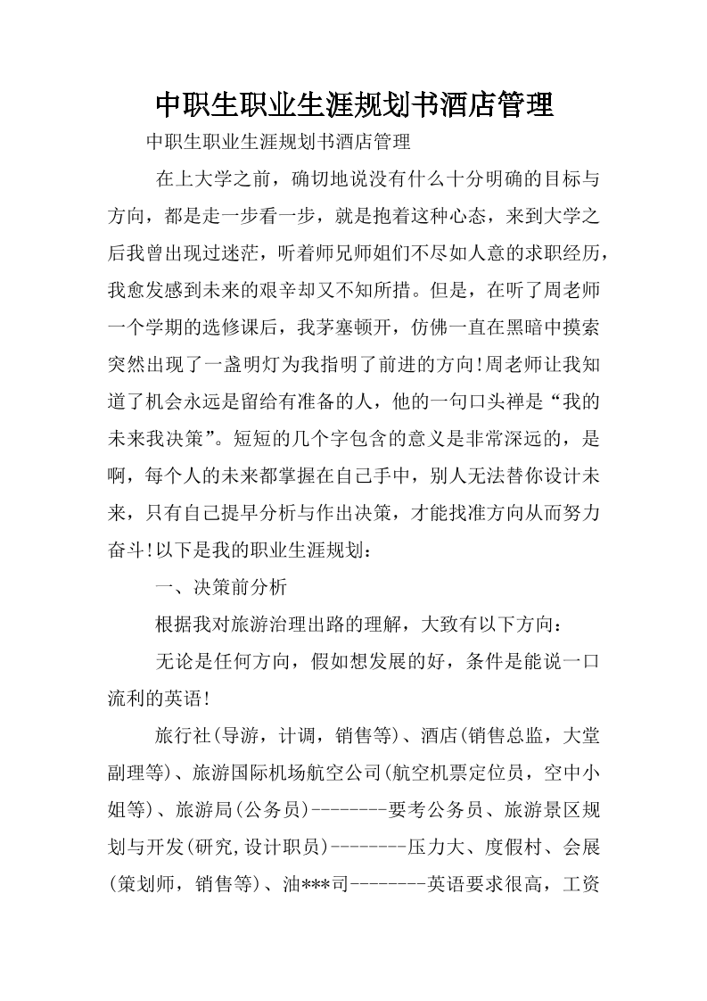 中职生职业生涯规划书酒店管理