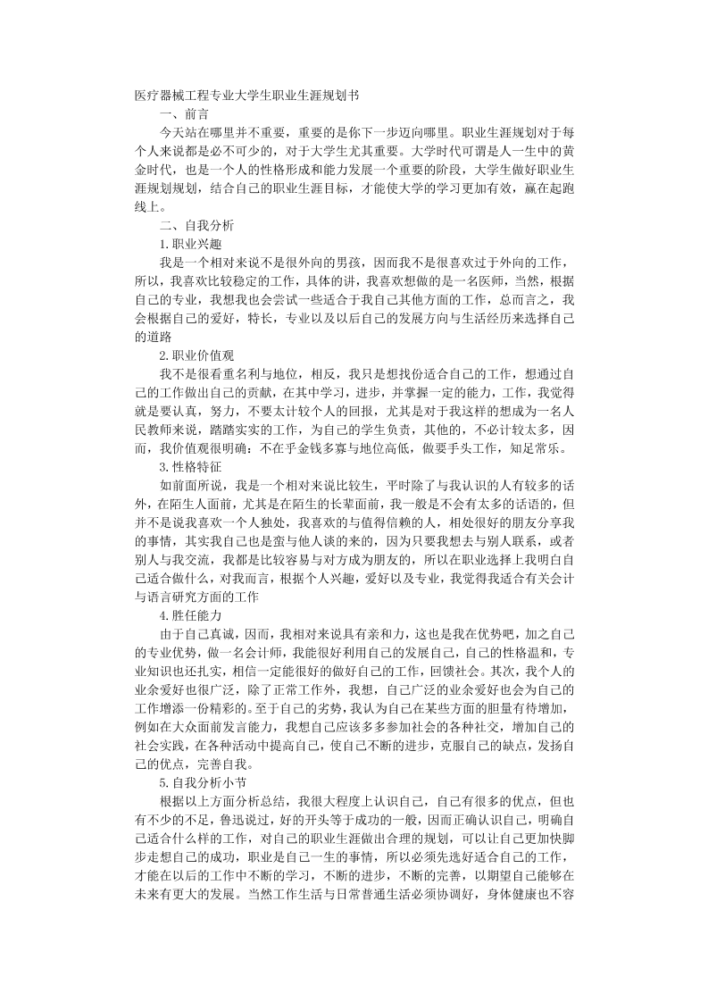 医疗器械工程专业大学生职业生涯规划书