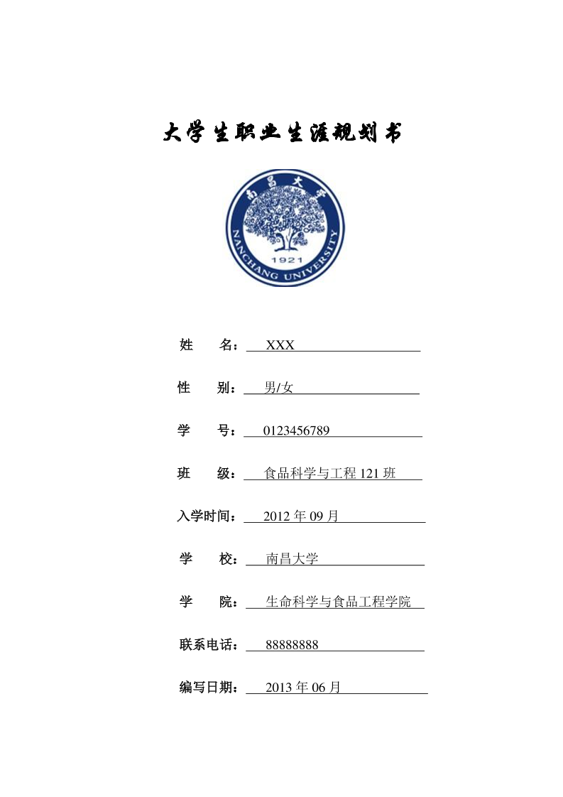 模版参考-食品某同学职业生涯规划书(不能照抄内容-可参考版式)